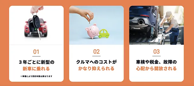 月々定額、車検も税金もコミコミをお好きな車で契約することが可能です。